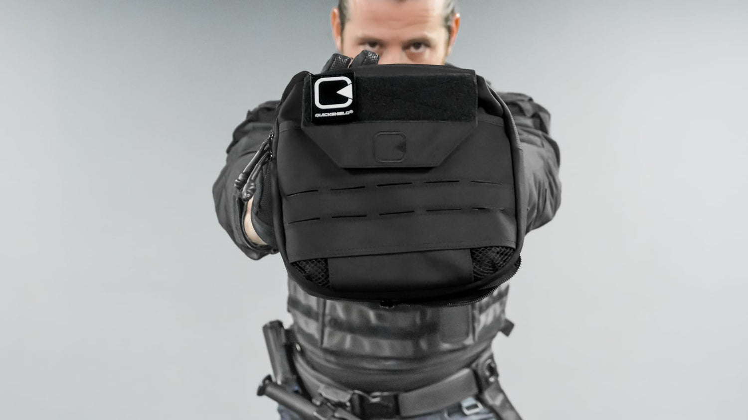 Der QUICKSHIELD hilft dir dabei, dich vor Angriffen mit Hieb und Stichwaffen zu schützen. Mit dem Tactical Set ist der Quickshield in eine Tasche eingehüllt und dient so als Stauraum sowie zum deeskalierenden Auftreten.